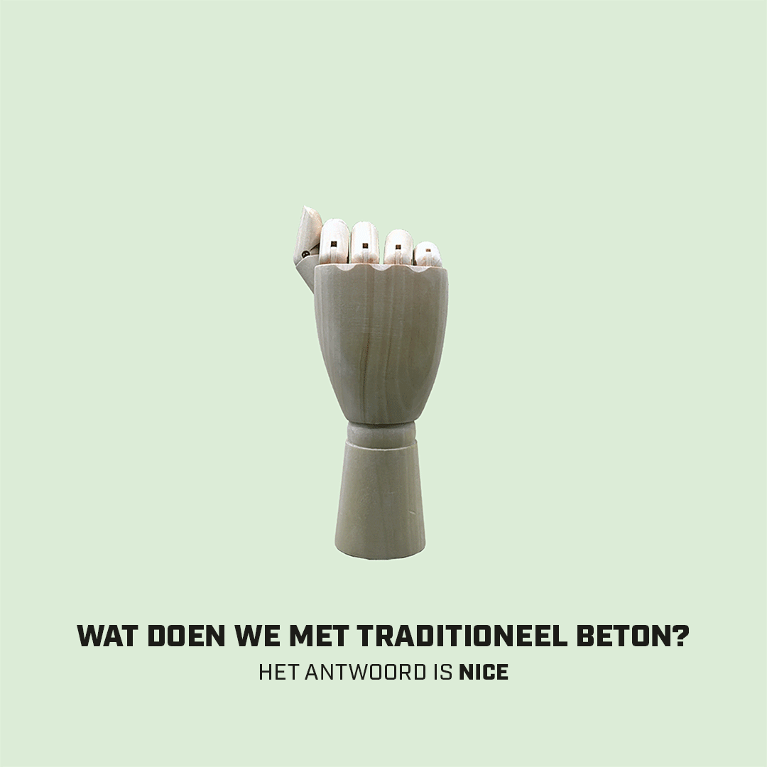 Achter NICE Developers schuilen ontwikkelend architect Robert Winkel en ontwikkelaar Mark Compeer. Vanuit de ambitie om de bouw- en ontwikkelwereld radicaal te veranderen, laten ze zich niet weerhouden door de status quo. Dat toont ook het krachtige campagnebeeld: een houten ledehand met opgestoken middelvinger naar het gebrek aan innovatie en het nog steeds blijven gebruiken van traditioneel beton – met een hoge uitstoot van CO2 als gevolg. Door te bouwen met hout en andere biobased materialen wordt CO2 opgeslagen in plaats van uitgestoten. Met harde, maar uitstoken houten hand wil NICE de bouwsector wakker schudden, want er zijn alternatieven. Het moet en kán beter!