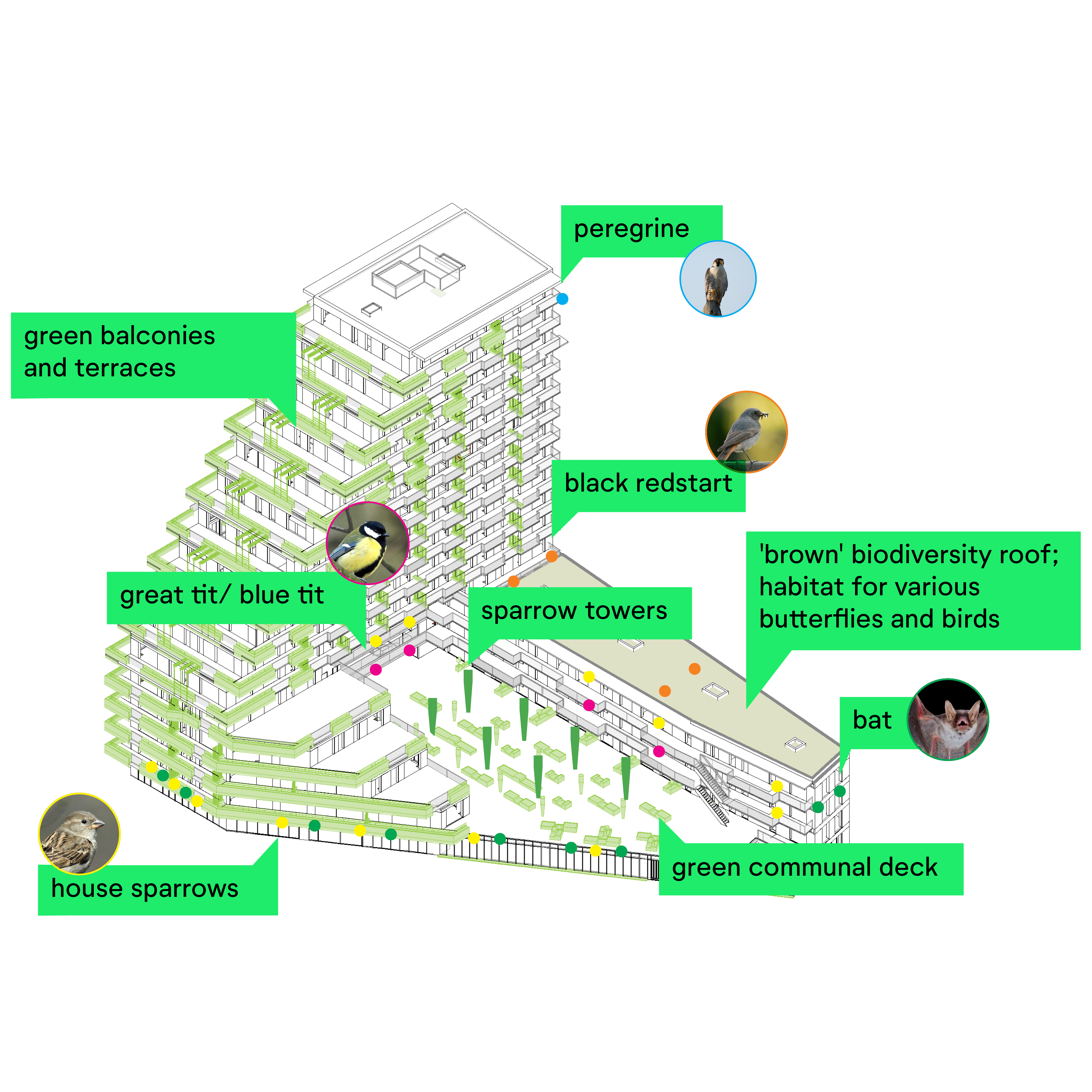 Naast het baanbrekende ontwerp en de circulaire houten constructie, draagt SAWA ook bij aan de biodiversiteit in de stad. De gevels bevatten maar liefst 700 strekkende meter aan plantenbakken, met daarin meer dan 3.000 plek-specifieke planten van 19 verschillende plantensoorten. Bovendien zijn er 140 nestkasten geïntegreerd, waaronder de speciaal ontworpen nestkast voor de slechtvalk. Door deze natuur inclusieve aanpak versterkt SAWA de biodiversiteit en sluit het aan op de bestaande ecologische structuren van de omgeving.