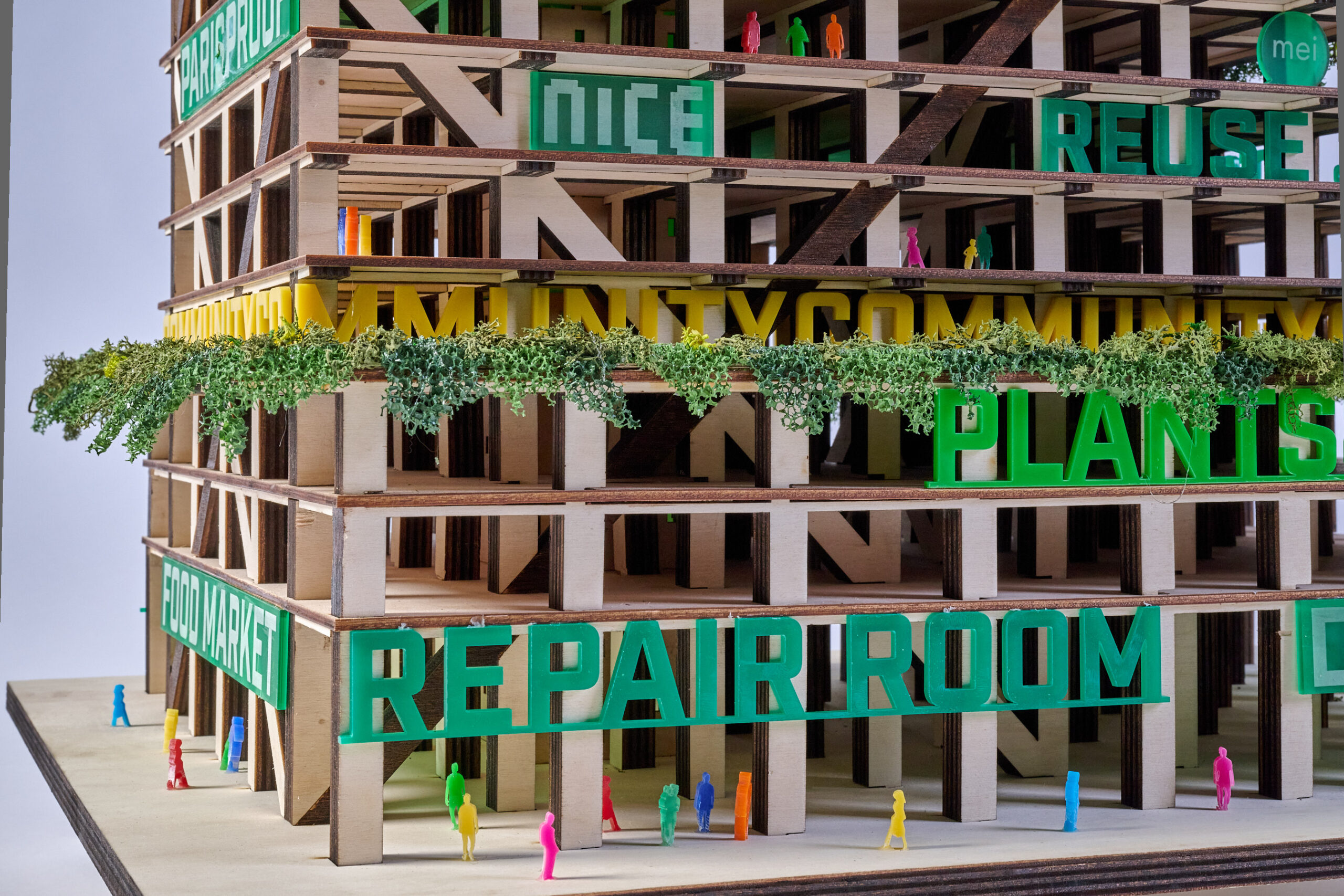 De NICE Tower, met een indrukwekkende hoogte van 140 meter hoog en volledig opgebouwd uit hout, is de volgende stap in de revolutie van circulaire houten hoogbouw. De toren ontleent zijn stabiliteit uit de houten schoren in de gevel en de houten liftkern, is volledig biobased en van de begane grond tot de liftkern en draagconstructie vrij van beton. Hierdoor wordt de CO2-uitstoot drastisch verminderd ten opzichte van traditionele betonnen gebouwen en helpt het de opwarming van de aarde tegen te gaan.